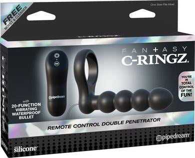 Double the pleasure and double the fun with the incredible Remote Control Double Penetrator! Stop fighting over the remote and enjoy the thrill of double penetration without introducing a third partner into the mix!Driven by a RC frequency that works up to 25 feet, this wireless double penetrator is the perfect couples toy that will add a new dimension to your lovemaking! Take control of the remote yourself or surrender it to your partner and give them total control. The wireless remote allows you to cycle through 20 thrilling pulsation patterns and find a function that's just right for you! You control when and how often double penetrator vibrates, while you both enjoy the kind of sex you've only dreamt about. Made from our body-safe, phthalate-free Elite Silicone, this double penetrator features a round beaded shaft that stimulates and excites your partner with each thrust. The powerful wireless bullet slides onto the base of the beaded stimulator and provides thrilling vibrations where you want them most! The stretchy silicone cockring puts a clamp on performance letdowns by delivering a tight squeeze to his shaft, while the smooth beaded exciter provides extra stimulation during double penetration. Wear the ring around your shaft and pick a hole'the flexible teaser can be used vaginally or anally for equally amazing results!Try it in the shower or hot tub and turn bath time into pleasure time. Cleanup is a snap after the fun with Pipedream Toy Cleaner and warm water. Use plenty of Moist for an extra wet and wild encounter!
